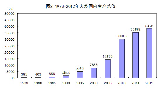 人均国内生产总值不断提高,成功实现从低收入国家向上中等收入国家的跨越。1978年人均国内生产总值仅有381元,1987年达到1112元,1992年达到2311元,2003年超过万元大关至10542元,2007年突破2万元至20169元,2010年再次突破3万元大关至30015元,2012年人均国内生产总值达到38420元,扣除价格因素,比1978年增长16.2倍,年均增长8.7%。人均国民总收入也实现同步快速增长,根据世界银行数据,我国人均国民总收入由1978年的190美元上升至2012年的5680美元,按照世界银行的划分标准,已经由低收入国家跃升至上中等收入国家,对于我国这样一个经济发展起点低、人口基数庞大的国家,能够取得这样的进步确实难能可贵。