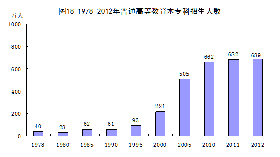 教育事业成绩显著。30多年来,党中央、国务院坚持教育优先发展的战略,不断加大教育投入力度,深化教育领域综合改革,大力促进教育公平,取得了一系列成绩。教育普及程度明显提高,城乡免费九年义务教育全面实现。国民受教育程度大幅提升。6岁及以上人口平均受教育年限由1982年的5.2年提高到2012年的8.9年。2012年,普通高等教育本专科招生人数689万人,比1978年增长16.1倍;在校生2391万人,增长26.9倍;毕业生625万人,增长36.9倍,较好地满足了经济社会发展对各类人才的需求。