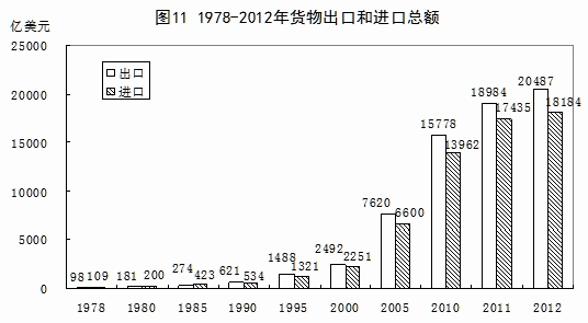 对外贸易总量不断攀升。改革开放初期,我国对外经济交流活动十分有限,再加上国内市场化水平不高,造成了与国际市场相对隔绝的状态。1978年,我国货物进出口总额只有206亿美元,世界排名第29位,1988年突破了1000亿美元,1994年突破了2000亿美元,1997年突破了3000亿美元,2004年又突破了1万亿美元大关,2012年,货物进出口总额已达到38671亿美元,比1978年增长186倍,年均增长16.6%,仅次于美国,位居世界第二位;货物出口总额20487亿美元,增长209倍,年均增长17.0%,居世界第一位;货物进口总额18184亿美元,增长166倍,年均增长16.2%,居世界第二位。2012年,我国货物出口总额和进口总额分别占世界的11.2%和9.8%。