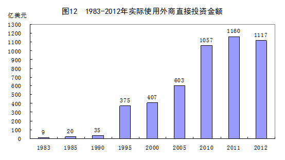引进外资与对外投资活动日益频繁。改革开放以来,我国充分发挥了资源、劳动力等要素优势和巨大的潜在市场优势,成为国际直接投资的热土,利用外资规模不断扩大,外商直接投资成为推动我国经济发展和技术进步的重要力量。1979-2012年,实际使用外商直接投资12761亿美元,1984-2012年以年均18.0%的高速度增长。我国已连续多年成为吸收外商直接投资最多的发展中国家,世界排名也上升至第二位。近些年来,随着我国企业实力的提升,“走出去”的步伐开始加大。中国对外直接投资净额由2007年的265亿美元快速提高到2012年的878亿美元,2012年末对外直接投资存量达到5319亿美元。
