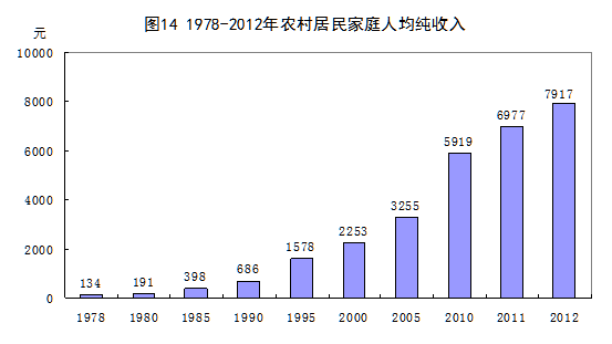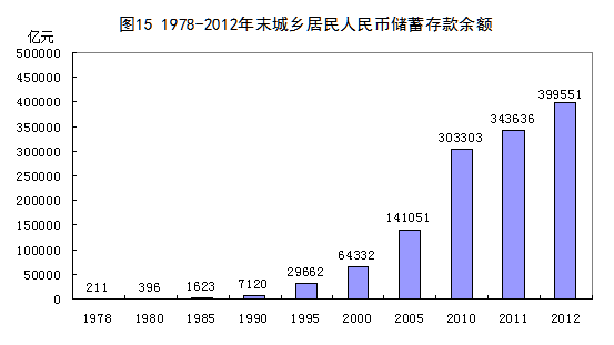 城乡居民收入显著提高。35年来,党中央、国务院深化收入分配制度改革,努力实现居民收入增长和经济发展同步、劳动报酬增长和劳动生产率提高同步,效率和公平兼顾,确保了城乡居民收入和财富的快速增长。2012年,城镇居民人均可支配收入24565元,比1978年增长71倍,年均增长13.4%,扣除价格因素,年均增长7.4%;农村居民人均纯收入7917元,增长58倍,年均增长12.8%,扣除价格因素,年均增长7.5%。城乡居民拥有的财富显著增加。2012年末,城乡居民人民币储蓄存款余额39.96万亿元,比1978年末增长1896倍,年均增长24.9%。股票、债券等金融资产规模不断扩大。城镇居民拥有的财产性收入从无到有,2012年占人均全部年收入比重上升到2.6%。