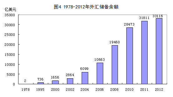 外汇储备大幅增长,实现从外汇短缺国到世界第一外汇储备大国的巨大转变。1978年,我国外汇储备仅1.67亿美元,位居世界第38位,人均只有0.17美元,折合成人民币不足1块钱。随着我国对外经济的发展壮大,经常项目贸易盈余不断积累,外汇储备的短缺迅速成为历史,1990年外汇储备超过百亿美元,达到111亿美元,1996年超过千亿美元,达到1050亿美元,2006年超过1万亿美元,达到10663亿美元,超过日本位居世界第一位,2011年超过3万亿美元,2012年达到33116亿美元,连续七年稳居世界第一位。