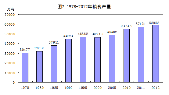 农产品供给不仅解决了占世界五分之一人口的温饱问题,还为工业化快速推进提供了重要支撑。35年来,党中央、国务院始终把农业生产放在十分重要的战略地位,千方百计促进农业生产,稳定粮食产量,不仅成功解决了中国人的温饱问题,实现了人民生活水平质的提高,而且为工业发展提供了丰富的原料。2012年,粮食产量达到58958万吨,比1978年增长93.5%,2004年以来实现“九连增”,连续6年稳定在5亿吨以上的水平;棉花产量684万吨,比1978年增长2.2倍;油料产量3437万吨,增长5.6倍;糖料产量13485万吨,增长4.7倍;水果产量24057万吨,增长35.6倍;水产品产量5908万吨,增长11.7倍。肉类产量8387万吨,比1979年增长6.9倍。2011年,谷物、肉类、籽棉、花生、茶叶、水果产量稳居世界第一位,油菜籽、甘蔗、大豆分列第二、三、四位。从人均水平看,2012年人均粮食产量达到436.5公斤,比1978年增长36.9%;人均棉花、油料、糖料、水产品产量分别达到5.1公斤、25.4公斤、99.8公斤和43.7公斤,分别增长1.2倍、3.7倍、3.0倍和8.0倍。