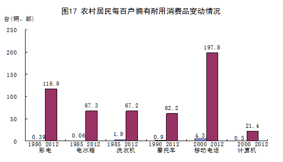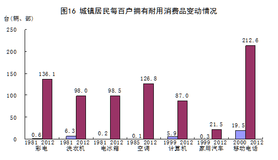 居民生活水平和质量极大改善。2012年,城镇居民人均现金消费支出16674元,比1978年增长52.6倍,年均名义增长12.4%;农村居民人均消费支出5908元,增长49.9倍,年均名义增长12.3%。城乡居民消费结构明显优化。2012年,城镇居民恩格尔系数为36.2%,比1978年下降21.3个百分点;农村居民恩格尔系数为39.3%,下降28.4个百分点。居住条件极大改善。2012年,城镇居民人均住宅建筑面积32.9平方米,比1978年增加26.2平方米;农村居民人均住房面积37.1平方米,增加29.0平方米。消费领域不断拓展,物质生活极大丰富。彩电、电冰箱、空调、电话等耐用消费品逐步普及,汽车、电脑等高档耐用消费品拥有量大幅提高。2012年末,城镇居民家庭平均每百户移动电话、计算机和家用汽车拥有量分别为212.6部、87.0台和21.5辆,分别比2000年末增加193.1部、77.3台和21.0辆。