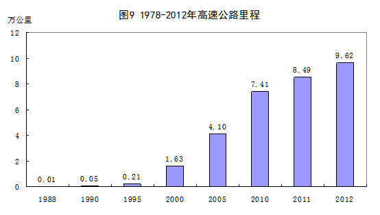 交通运输设施日益完善。35年来,我国交通网络不断完善,运输能力不断增强,运输效率不断提高,有力地支撑了各项产业的发展。2012年,我国铁路营业里程达到9.8万公里,比1978增长88.8%,居世界第二位;公路里程424万公里,增长3.8倍;民用航空航线里程328万公里,增长21.0倍;输油(气)管道里程9万公里,增长9.9倍;沿海主要港口货物吞吐量66.5亿吨,增长32.5倍,连续多年居世界第一。一些现代化交通运输设施从无到有,增长迅猛。改革开放之初我国尚无高速公路,2012年,我国高速公路里程达到9.62万公里,位居世界第二。高速铁路飞速发展,生产出时速高达350公里的动车组,标志着我国铁路运输达到国际先进水平,2012年,高铁运营里程达9356公里,居世界第一位。