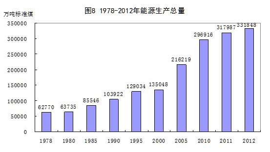 能源生产能力不断提高。随着工业化的推进,我国逐渐成为能源消费大国,与此同时,能源生产能力也不断提升,能源自给率保持较高水平,一定程度上保证了国家经济安全。2012年,我国能源生产总量达到33.2亿吨标准煤,比1978年增长4.3倍,年均增长5.0%。同期,我国能源消费总量年均增长5.6%,与能源生产增速的差距不大,能源总自给率达到90%以上。能源生产结构不断优化,水电、核电、风电等清洁能源和可再生能源生产量在能源生产总量中的比重由1978年的3.1%提高到2012年的10.3%。