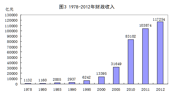 国家财政实力明显增强,政府对经济和社会发展的调控能力日益增强。1978年国家财政收入仅1132亿元,1985年翻了近一番,达到2005亿元,1993年再翻一番,达到4349亿元,1999年跨上1万亿台阶,达到11444亿元,2007年超过5万亿元,达到51322亿元,2011年再次超过10万亿元,2012年,我国财政收入达到117254亿元,比1978年增长103倍,年均增长14.6%。财力的增加对我国促进经济发展、加强社会保障、减小城乡差距、切实改善民生、有效应对各类冲击提供了有力的资金保障。
