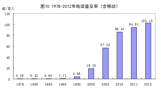 邮电通信业突飞猛进。35年来,我国邮电通信业规模不断扩大,服务种类不断丰富,推动我国信息化水平不断提高。邮政营业网点由1978年的5.0万处扩张到2012年的9.6万处,增长92.6%;邮路总长度由1985年的142万公里提高到586万公里,增长3.1倍;2012年,全国通邮的行政村比重达到99.1%。固定长途电话交换机容量由1978年的0.2万路端提高到2012年的1580万路端,增长8479倍;局用交换机容量由406万门提高到43749万门,增长106.8倍。固定电话用户由192.5万户提高到2.8亿户,增长143.5倍;电话普及率由1978年的每百人0.38部提高到2012年的每百人103.10部;移动电话业务从无到有,手机已由上世纪九十年代的奢侈品变为现在的生活必需品,2012年普及率达到每百人82.50部,几乎达到了所有成年人人手一部的水平。互联网设施迅猛发展,互联网普及率由2002年的4.6%迅速提高到2012年的42.1%。