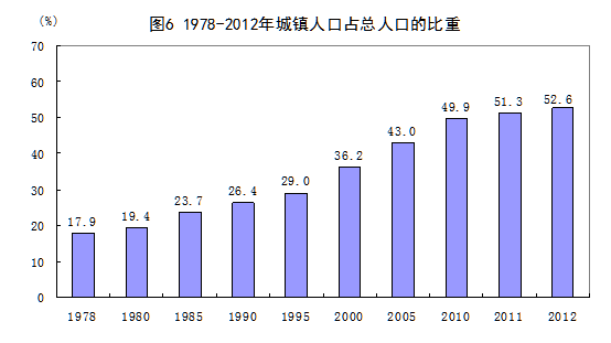 城镇化步伐明显加快。城镇化水平由1978年的17.9%上升到2012年的52.6%,上升了34.7个百分点,年均上升1.0个百分点。城镇总人口年均增加1586万人,乡村总人口年均减少435万人。城镇化水平的提升促进了城乡经济的协调发展,有利于居民消费结构升级,并不断催生新的经济增长点,是扩大内需的最大潜力所在。随着城镇化和工业化进程的加快,城镇吸纳就业的能力也不断增强。城镇就业人员占全国的比重从1978年的23.7%上升到2012年的48.4%,乡村就业人员占比从76.3%下降51.6%。