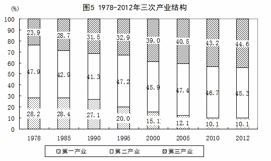 产业结构不断优化。35年来,三次产业在调整中均得到长足发展,农业基础地位不断强化,工业实现持续快速发展,服务业迅速发展壮大。1979-2012年,第一、二、三产业增加值年均实际分别增长4.6%、11.3%和10.8%。三次产业增加值在国内生产总值中所占的比例由1978年的28.2:47.9:23.9调整为2012年的10.1:45.3:44.6。与1978年相比,2012年第一产业比重下降18.1个百分点,第二产业比重下降2.6个百分点,第三产业比重大幅上升20.7个百分点。