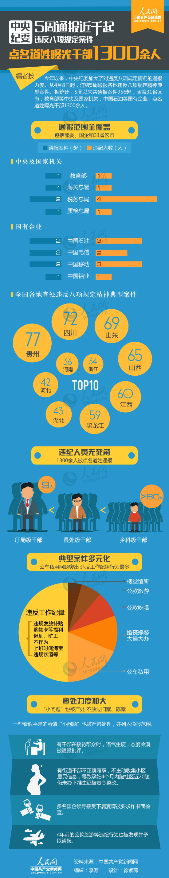 今年以来,中央纪委加大了对违反八项规定情况的通报力度。从4月8日起,连续5周点名道姓通报各地违反中央八项规定精神典型案件。据记者统计,5周以来中央纪委共通报全国违反八项规定案件956起,涵盖了31个省区市,教育部、海关总署等中央及国家机关,中国石油、中国铝业等国有企业。通报中,点名道姓曝光干部1300余人。