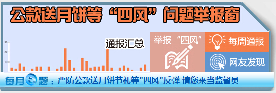 纠正“四风”,要紧盯重要时间节点。中秋临近,为进一步落实中央八项规定精神,严防“四风”反弹,中央纪委监察部网站8月10日开通公款送月饼等“四风”问题举报窗,畅通监督举报渠道,同时每周通报各级纪检监察机关查处的违反中央八项规定精神的案件。这是继“五一”前后开设纠正“四风”监督举报直通车之后,再次恢复周周通报,旨在强化监督执纪问责工作,发挥警示和震慑作用,努力还大家一个风清气正的节日。