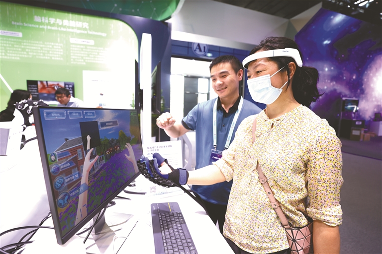 图为观众在2023中关村论坛展览(科博会)上体验脑机接口手功能康复训练与评估系统。