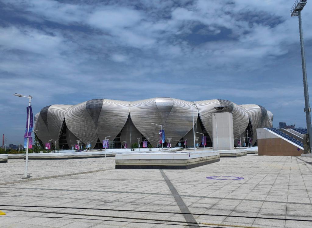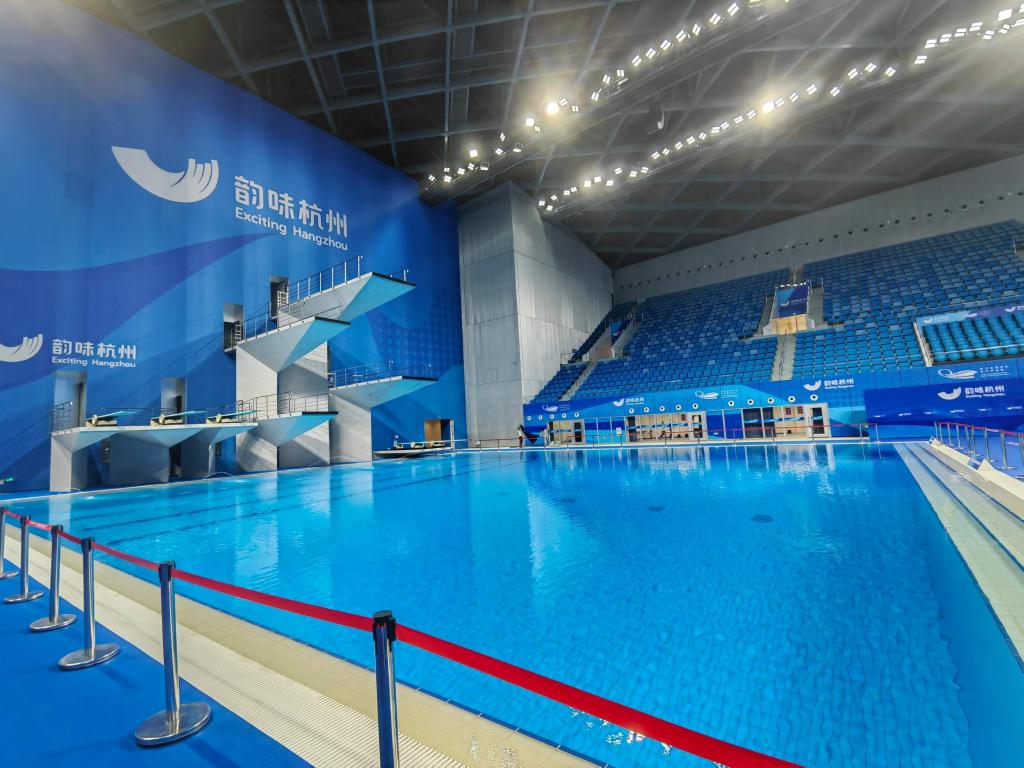 “化蝶”的另一翼,是拥有约6000个观众席位数的杭州奥体中心游泳馆,作为游泳、跳水、花样游泳项目的比赛场馆及训练场馆,游泳馆内设有比赛池、跳水池、热身池等五个水池以及10米台、5米台、3米板、1米板等设施。